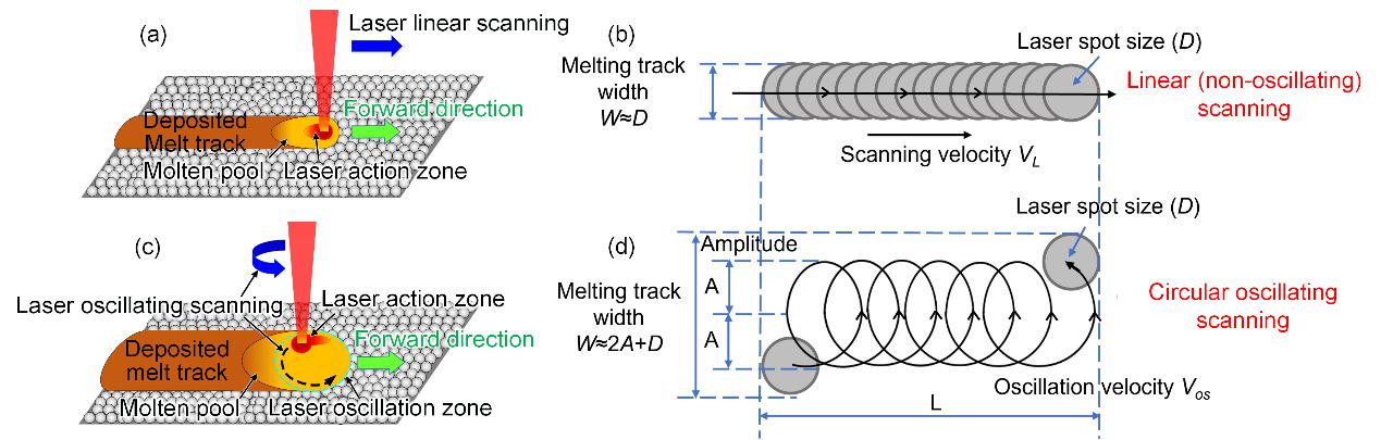 图1两种扫描策略的原理示意图:(a,b)直线扫描策略;(c,d)圆形振荡扫描策略