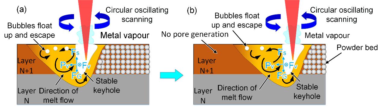图3圆形振荡扫描抑制气孔缺陷示意图:(a)匙孔较稳定,且熔池内气泡上浮逸出;(b)已成形实体中未形成圆形气孔和不规则气孔