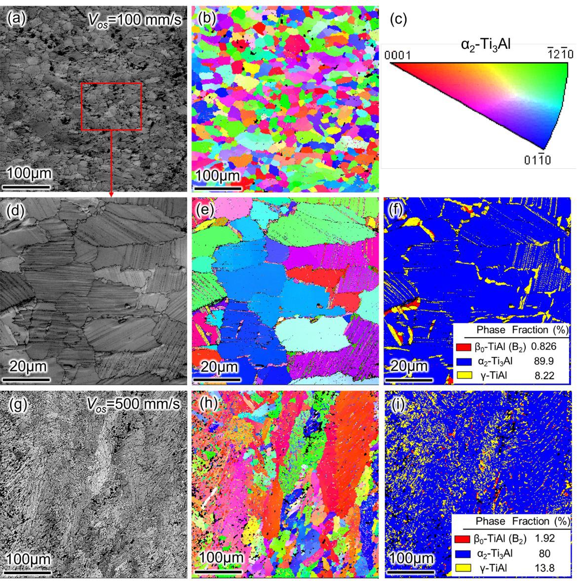 图2采用圆形振荡扫描策略成形Ti-43Al-9V-0.5Y合金试样纵截面的EBSD分析结果:(a,d,g)BC图;(b,e,h)反极图;(c)极图;(f,i)相分布图
