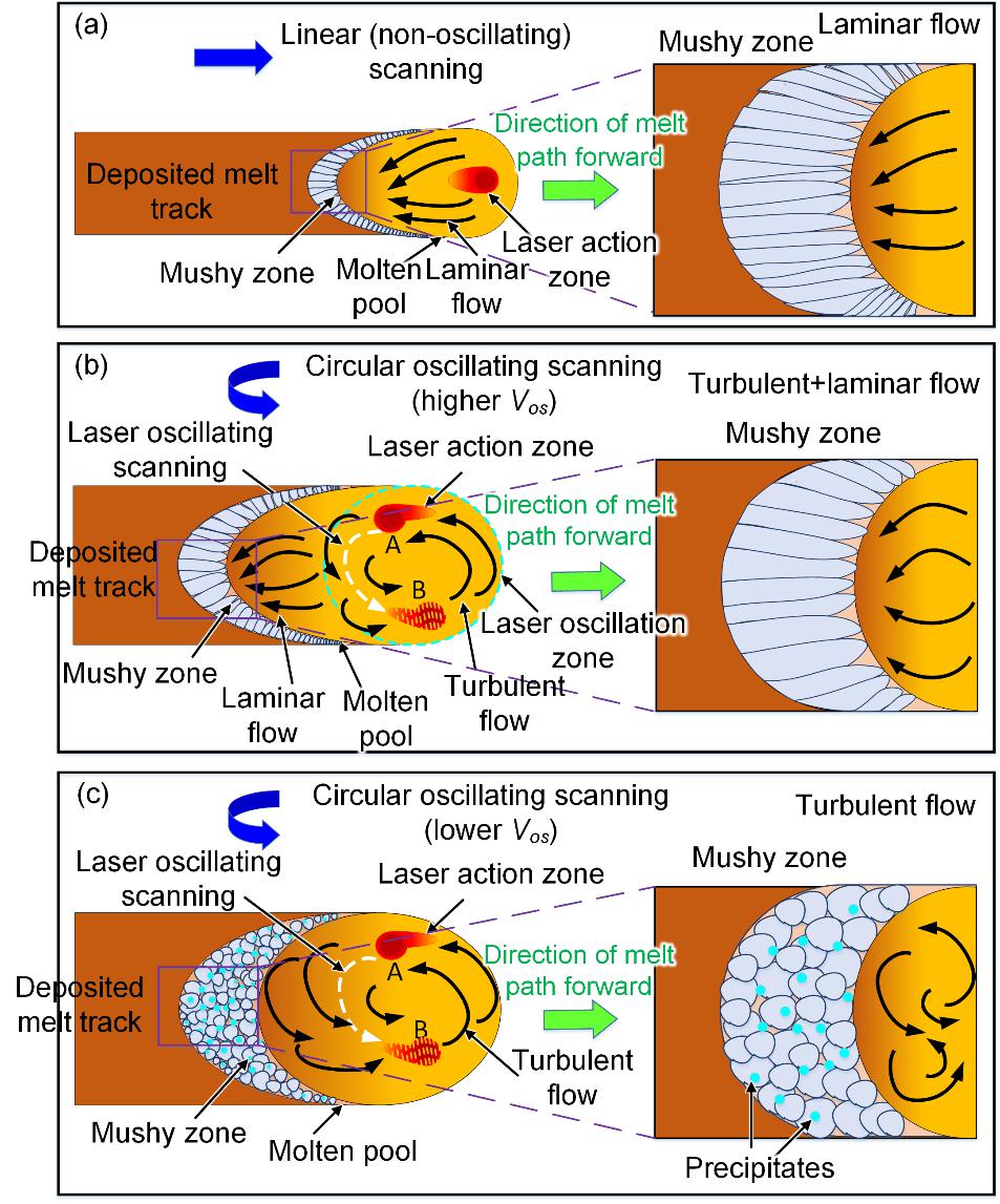 图4 两种扫描策略成形试样的显微组织特征示意图:(a)激光直线扫描;(b)较高振荡速度(>100 mm/s)的圆形振荡扫描;(c)较低振荡速度(≤100 mm/s)的圆形振荡扫描