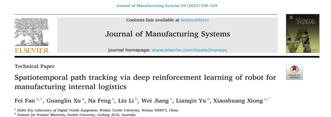 近日,yl6809永利集团余联庆教授课题组青年教师樊飞博士在面向织造车间智能物流机器人轨迹跟踪控制方面取得了重要研究进展。相关成果以“Spatiotemporal path tracking via deep reinforcement learning of robot for manufacturing internal logistics”在工程技术领域主流高水平期刊《Journal of Manufacturing Systems》(中科院一区Top,IF12.1,ISSN:1878-6642)上发表。该论文的第一单位为yl6809永利官网集团,第一作者为永利集团樊飞博士。