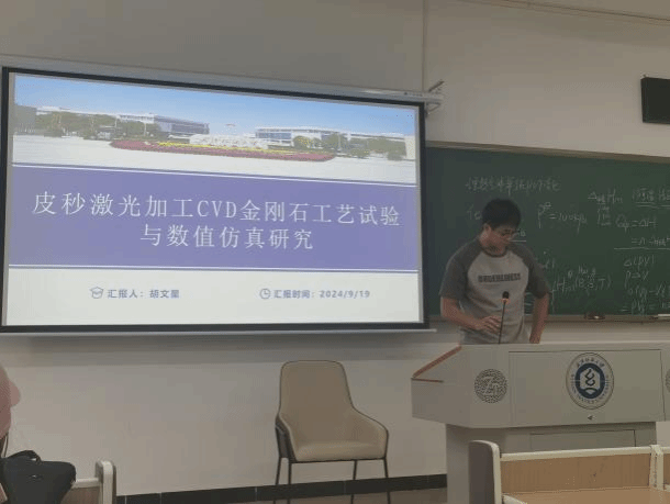 胡文星同学分享了他的课题“皮秒激光加工CVD金刚石工艺试验与数值仿真研究”,其研究的目标是将CVD单晶金刚石作为研究对象,使用355nm皮秒激光加工平台进行工艺试验,采用ANSYS软件可视化模拟皮秒激光加工CVD金刚石的过程,并通过实验结果验证仿真模型,最终实现仿真指导实验的目的,通过优化的工艺参数制备高质量微孔、微槽和阵列微结构。