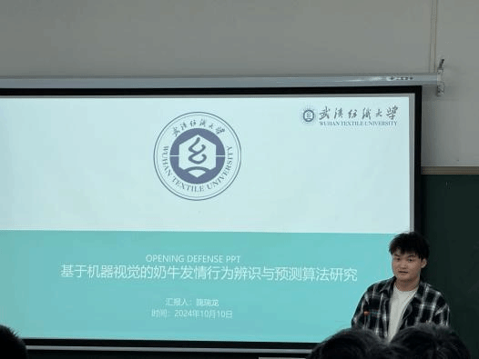 吴瑞志同学分享了他的课题“基于双重注意力及多特征融合的奶牛姿态检测算法研究”,研究的内容是对数据的采集,对数据进行预处理,制作相应的数据集,模型的搭建以及模型的训练,对训练出的模型进行改进优化,最后进行实验验证。