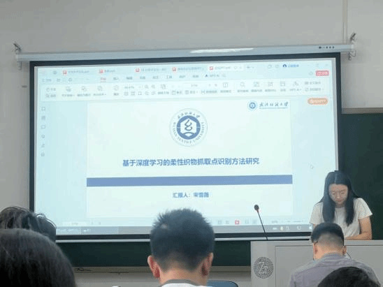 宋雪薇同学分享了她的课题“基于深度学习的柔性织物抓取点识别方法研究”,研究的内容是开发一种能够自动识别柔性织物上最佳抓取点的方法,以便机器人或其他自动化设备能够高效、精确地抓取和处理柔性织物,研究的内容主要是数据的采集、特征的提取与预处理、抓取点识别算法、抓取点评估与验证、系统集成与实验。