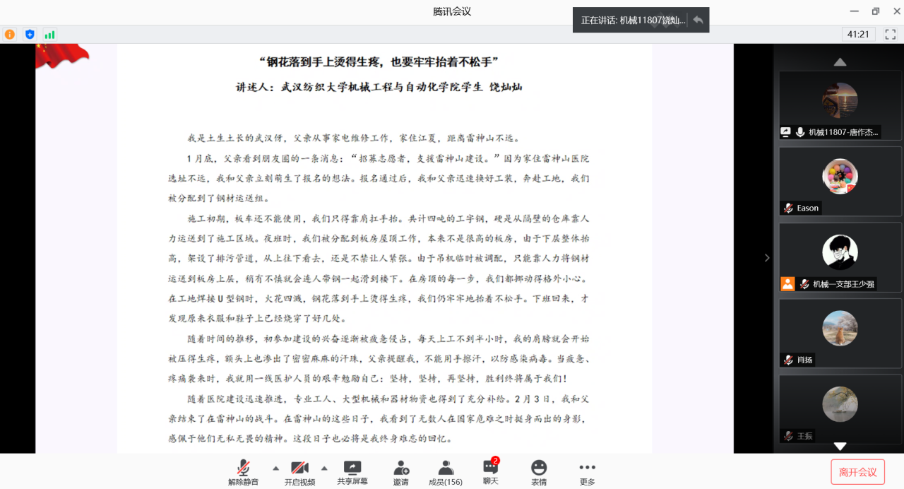 机械学生一支部书记王少强发言,今天饶灿灿同学给我们上了非常生动的一课,他作为一名普通学生却冲在了战争的前线,我们都知道在疫情爆发的时候,有很多的人义无反顾逆向前行,为什么呢,我觉得是因为他们肩上有着他们的任务和责任。我知道谁说的,我记得当时疫情爆发的时候有这么一句话,党员第一个顶上去。这愈发让我体会到身为一名党员的荣誉和自豪,所以我决定将来要更加的肩负起自己的责任,建设和守护国家!