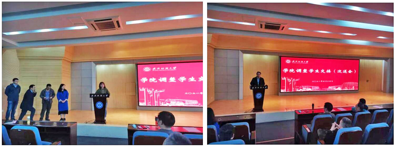 原现代纺织学院党总支常务副书记肖迪明主持了上半程会议,首先由原现代纺织学院院长李德骏教授发表讲话,李院长简短而意味深长地表达了对学生的不舍、感激和期望,充分肯定了永利集团的教学管理,希望学生尽快适应变化、融入新集体。随后辅导员谢超、鄢琳对学生表达了真挚的感谢和祝福。