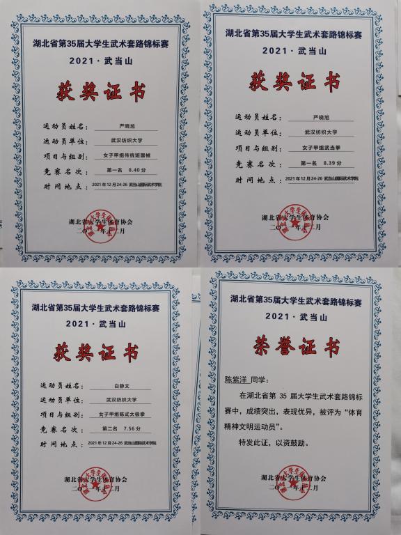 此次参赛的yl6809永利官网集团武术队由体育部部长叶冬茂领队,青年教师漆才杰担任教练,武术队5名队员(其中3名是永利集团学生)参加了6个单项的比赛。经过三天的紧张角逐,我院的严晓旭同学以扎实的功底,精彩的发挥斩获女子甲组传统短器械组冠军、武当拳冠军,白静文同学获得女子甲组陈式太极第二名、陈紫洋同学获得男子甲组八极拳第八名,陈紫洋同学还获评“体育精神文明运动员”荣誉称号。
