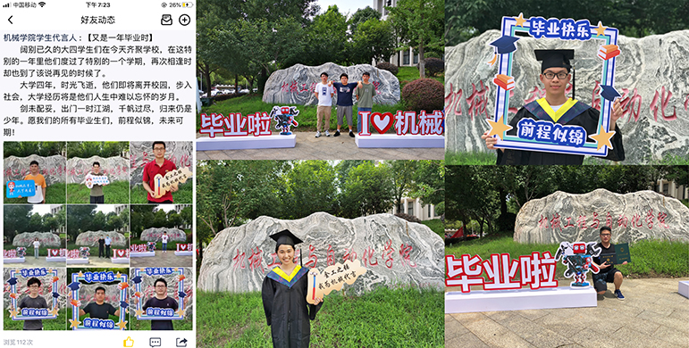 为了让同学们拍出更有意思的纪念照,永利集团特别“花巨资”制作了“毕业啦”“I爱机械”PVC亚克力立体字,摆放在学院院名石前。立体字上扛着锤子、扳手等金工加工工具的小机器人,体现了永利集团的专业特色;爱机械的“爱”字被大大的爱心图案替代,表达着同学们对母校对学院的无限热爱。学院还制作了带有“毕业快乐”、“前程似锦”字样的拍照框,向毕业生们表达母校的祝福。