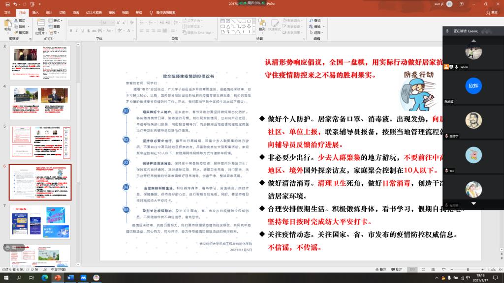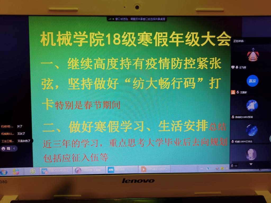 1月17日至18日,学院各辅导员分别组织召开了线上网络班会和年级大会,开展寒假假期安全教育活动,重点强调疫情防控注意事项,教育学生要切实增强个人防护意识,养成勤洗手、“一米线”等卫生习惯和生活方式;要求学生按照属地管理原则、服从属地管理,尽量减少外出,教育、引导学生以正确的认识和科学、安全的方法做好自我保护;提醒学生注意防范今冬明春新冠肺炎疫情与其他常见传染病叠加风险。各年级大会上,辅导员们还通过介绍学院退役学生士兵事迹等进行了征兵政策宣讲,营造氛围,积极引导有志青年踊跃参军入伍;提醒同学们警惕电信诈骗、非法校园贷;注意假期交通安全,防范迷信和宗教渗透风险。辅导员和班主任运用精心制作的PPT,结合具体案例,组织同学们在认真开展学习后各个发言,谈认识、谈感受,切实增强了教育效果。