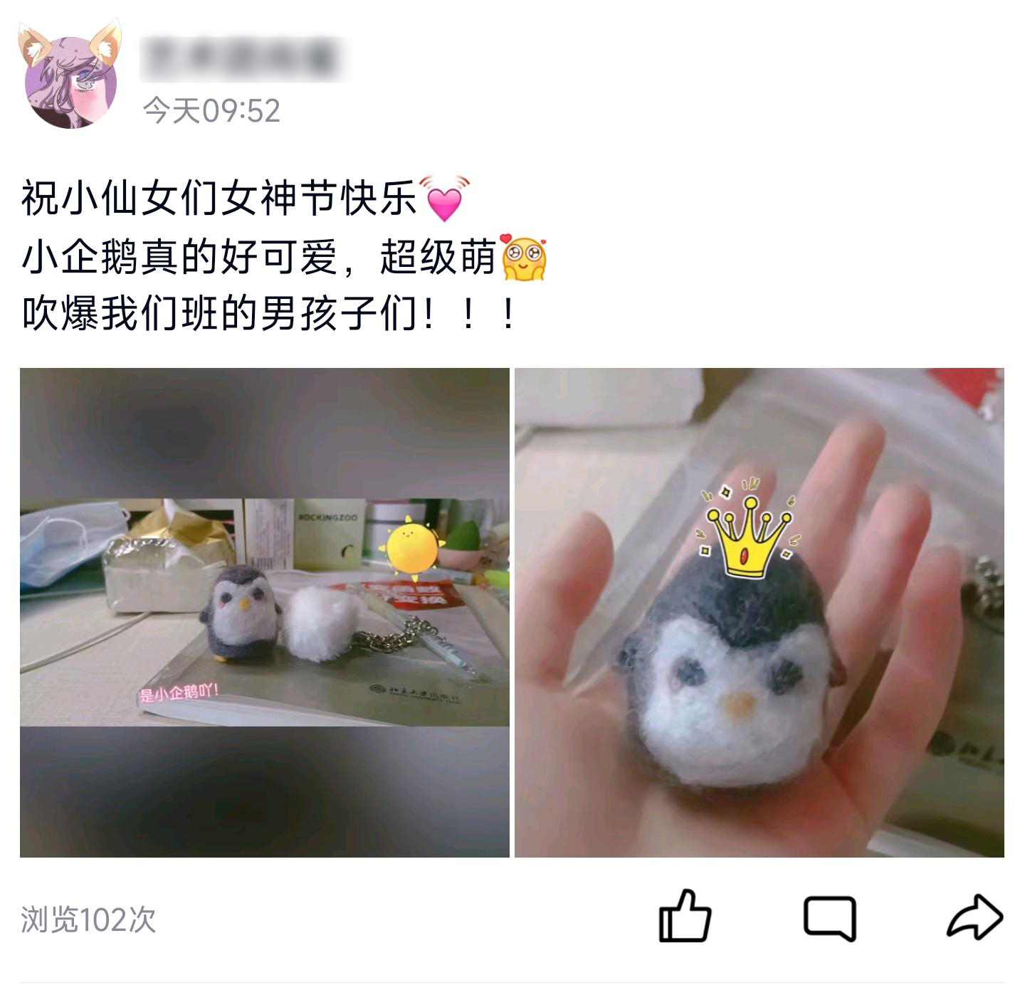 “我感觉自己已经变成了一枚大暖男,白天里认认真真学网课,夜里勤勤恳恳地做手工”,“虽然我们学院的女生最少,但我觉得她们每一个人都是我们学院的宝”,“这个礼物真的有心了,超级可爱,吹爆我们班的男孩子们!”......学院的男生和女生们纷纷在朋友圈和QQ动态里积极发表自己的活动感受和获赠感言。