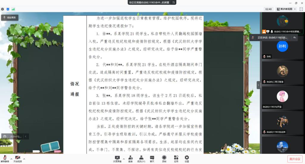 班会还对本学期开学以来疫情防控期间违纪学生处分情况进行了通报,提醒全体学生引以为戒。