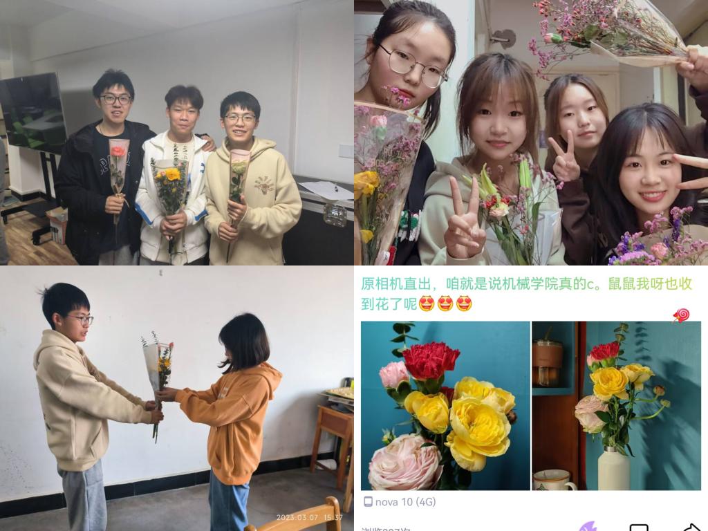 机械12206班熊志豪一边选花,一边学着用包装纸包扎花束,虽然略显笨拙,但是开心的笑容始终洋溢在脸上,“我从来没有做过花艺,手被花刺剌了几道印子,但是想着能为班上女同学送上礼物,心里也暖洋洋的,真的体会了送人玫瑰手留余香的感受!”经过大家不懈努力的制作后,男同学们都成功制作出了一束束精美的花束礼品。