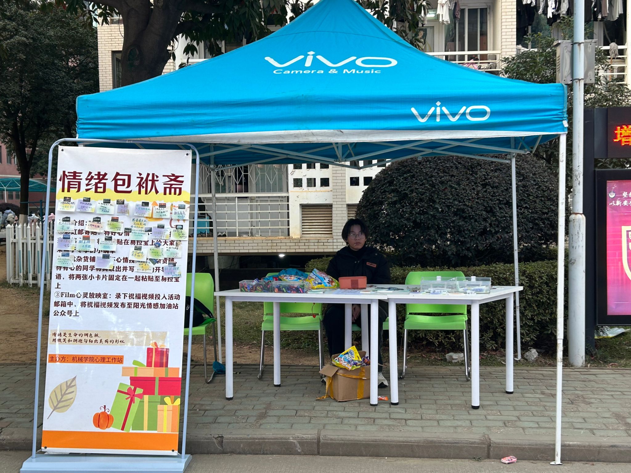 为让同学们进行情绪交流,甩开不良情绪,开心拥抱美好的大学生活,培养大学生乐观向上、努力奋斗的良好心理品质,促进人格健全发展,永利集团心理工作站于3月9日在一食堂门口开展情绪包袱斋的摆点活动。