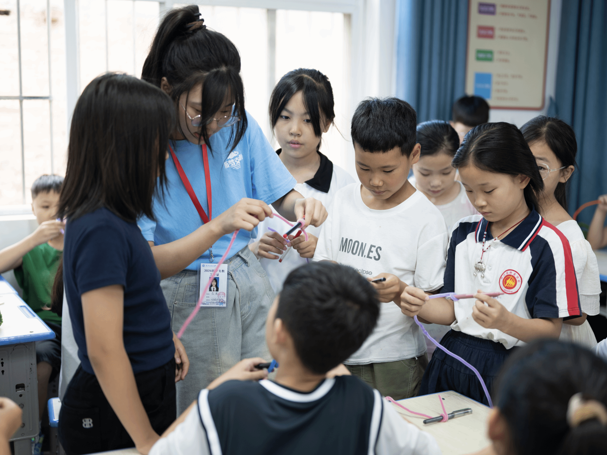 在支教老师的指导下,学生们学习了绒花的历史背景,了解了绒花的制作工艺,并亲自动手尝试制作。在支教活动中,扭扭棒成为了孩子们发挥想象力和创造力的神奇工具。支教老师们耐心地向孩子们介绍扭扭棒的特点和使用方法,一步步引导孩子们探索扭扭棒的无限可能。孩子们的热情被迅速点燃,他们全神贯注地摆弄着手中的扭扭棒,将自己的奇思妙想融入每一个作品中。五彩的扭扭棒在孩子们的巧手下变成了一朵朵绚丽的花朵、一只只可爱的小动物,还有充满童趣的饰品和摆件。