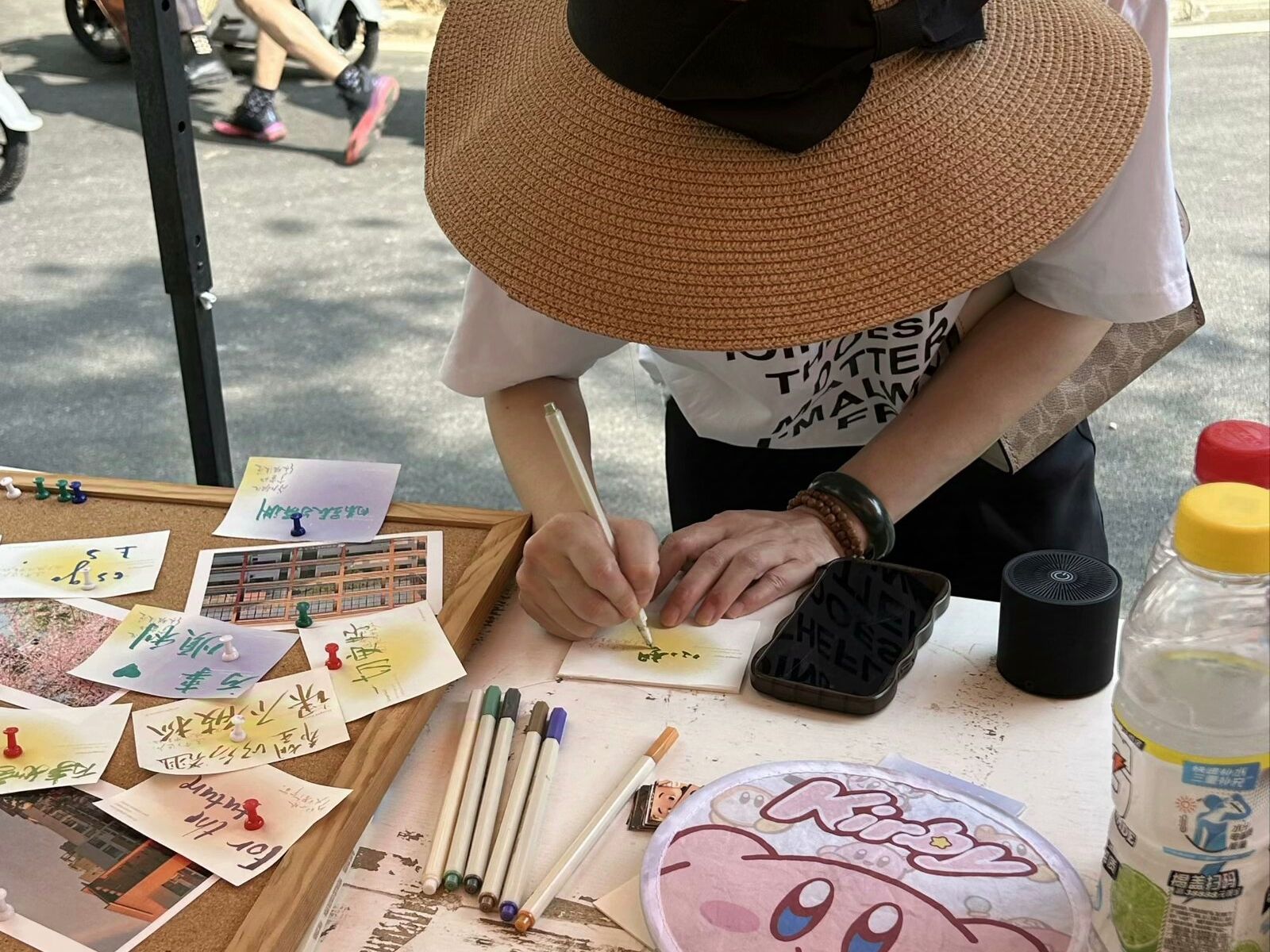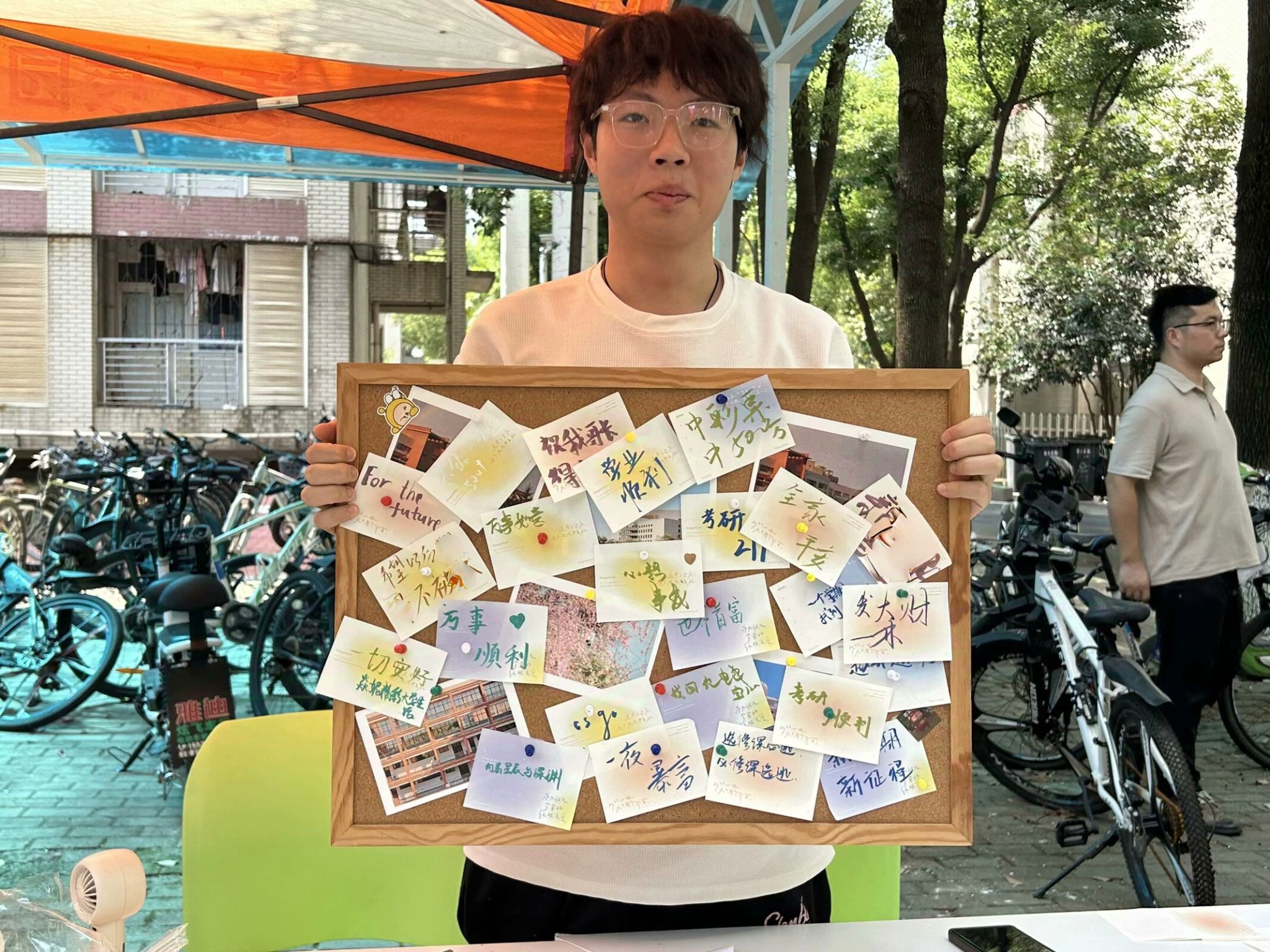 志愿者在迎新摆点处布置好了愿望板、多种纺大风景明信片,为迎接新生的到来做好了十足的准备。刚刚来到学校的新同学在精心挑选自己心仪的纸片并将对未来自己的美好期望写在上面并将其钉在愿望板上,与家长一同憧憬美好的未来。