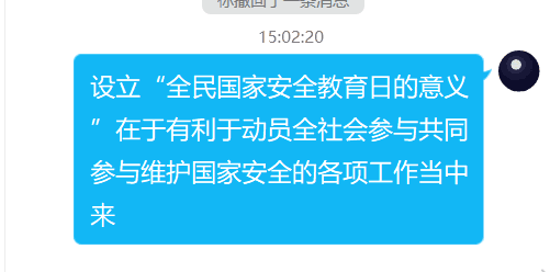 机器人11902班吴静:通过此次学习活动,我收获颇多,不仅了解了与全民安全教育日相关的知识,也增强了自身的安全意识。对于维护国家安全,既要做,也要说,要在全社会形成一种高度统一的认识:维护国家安全光荣,损害国家安全可耻。
