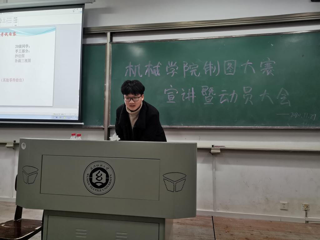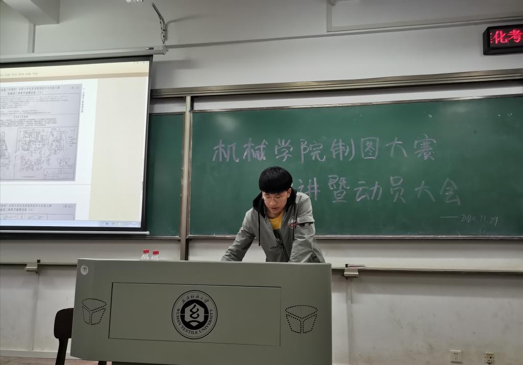 会上,刘溢华同学向大家展示了纺大在历届机械制图大赛中取得的优秀成绩,激发同学们的兴趣,希望同学们积极参赛,再创佳绩。刘溢华同学从大赛的考试内容、考试事项、考试时间等方面,向同学们进行了全面的介绍,并结合往年试题进行了详细的讲解,让同学们对大赛有了基本的了解。
