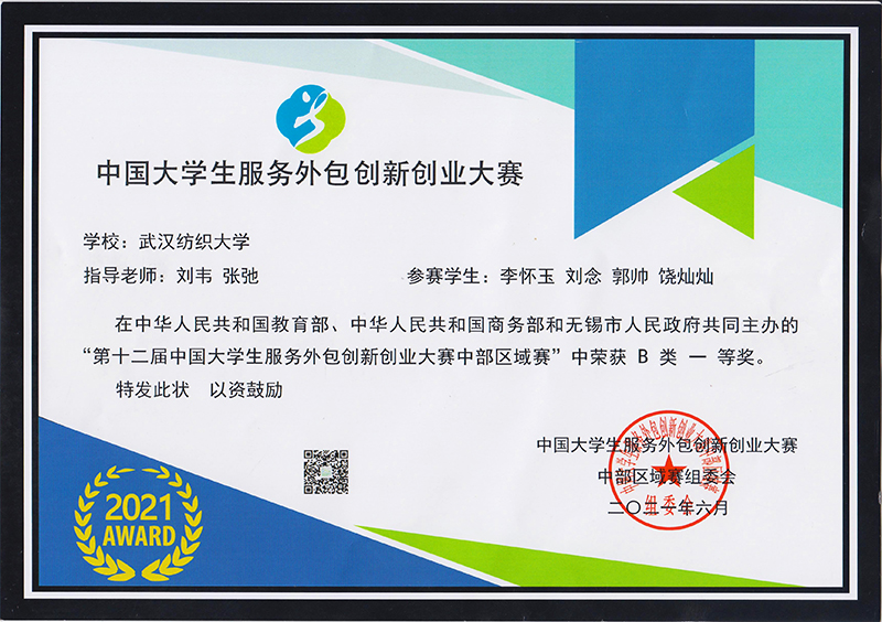 此前不久,在教育部、商务部和无锡市政府共同主办的“第十二届中国大学生服务外包创新创业大赛中部区域赛”中,李怀玉团队也荣获B类一等奖(7月底将冲击全国总决赛)。