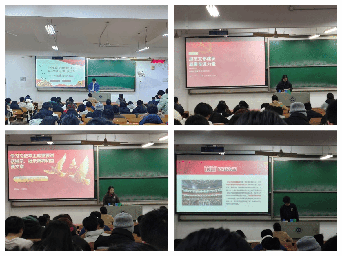 三位主讲人围绕主题依次汇报学习成果。首先,刘丹丹同学带领全体党员深入学习习近平总书记相关重要论述,导读胡耀邦同志的崇高风范与革命精神,为党员的思想淬炼与行动实践提供了明确指引;龙天同学聚焦 “全面推进美丽中国建设 —— 学习《习近平谈治国理政》第五卷”学习心得,系统解读了关于美丽中国建设的核心目标、实践方针与战略部署,让大家深刻领略到习近平总书记的远见卓识与战略智慧;胡雨蝶同学围绕“规范支部建设,凝聚奋进力量 —— 以制度遵循提升党建质效”进行主题分享,着重强调要以制度建设为抓手,结合支部实际需求,打造内容新颖、形式多样、富有实效的主题党日活动,切实提升党建工作质量与水平。