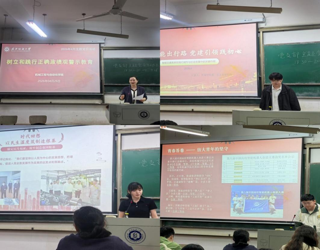 活动伊始,全体党员进行奏唱国歌,重温入党誓词活动。随后周雨洁、何照峰、许佳伟三位同学围绕“智造中国”主题依次分享。许佳伟立足青年科创实践,以创新成果与竞赛成绩展现青年助力大国智造的责任担当;周雨洁从日常智能用品切入,解读智造战略与民生需求的紧密联系;何照峰聚焦智能交通领域,阐释党建引领下出行服务的升级路径。随后,周书记开展树立和践行正确政绩观警示教育,剖析反面典型案例,要求全体党员严守纪律底线,深耕机械专业领域,务实履职担当。