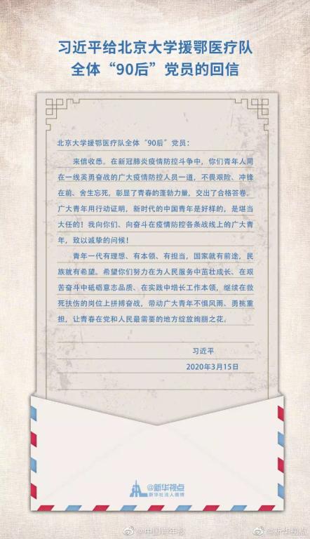 中共中央总书记、国家主席、中央军委主席习近平3月15日给北京大学援鄂医疗队全体“90后”党员回信,向他们和奋斗在疫情防控各条战线上的广大青年致以诚挚的问候。永利集团全体学生党员深受鼓舞,开展了回信精神深入学习,交流分享个人学习体会。