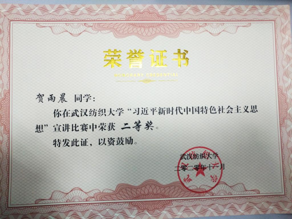 近日,由马克思主义学院和研究生处共同举办的——2020年yl6809永利官网集团研究生“习近平新时代中国特色社会主义思想”宣讲比赛顺利举行,我院研究生党支部入党积极分子、2020级研究生贺雨晨荣获二等奖。