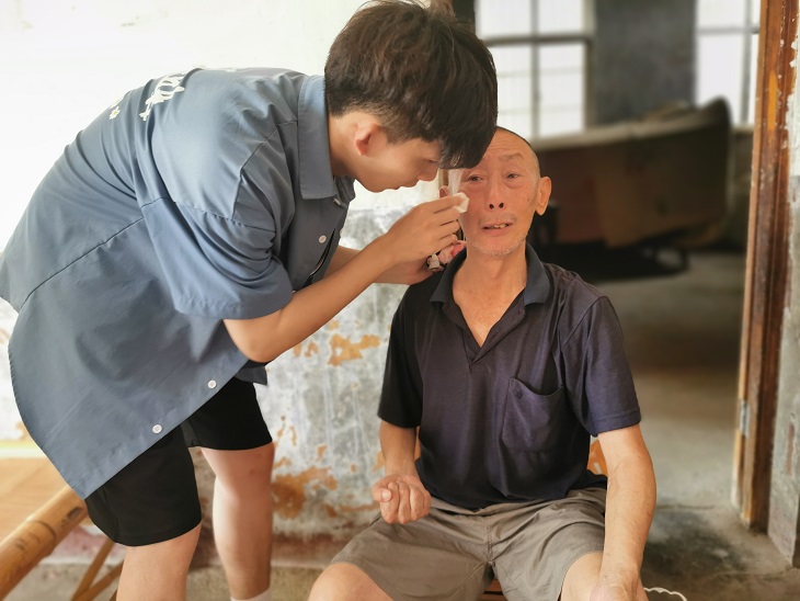 最后,实践团队在陈支书的引导下,来到了陈绪柏老人的家里。陈绪柏老人因身体原因已不能自如地与大家交流,但他布满皱纹的皮肤和黝黑的肤色仿佛在向大家讲述着老先生的光辉事迹。当得知是大学生专程前来看望他时,陈绪柏老先生的眼中顿时盈满了泪水,他的女儿向大家解释道:老人对中国共产党的感情已深入心底,当看到一个个年轻的党员和入党积极分子朝气蓬勃走来时,他的心里倍感欣慰,激动的心情不能通过言语来表达,只能用动作和泪水来传达自己的心意。队员们纷纷掏出纸巾为老人擦拭眼泪,表示能读懂他的意思、明白他的心底话,自己作为青年党员一定不会辜负他的期望,承上启下,将老人爱党爱国、坚守初心的红色基因继续传承下去。