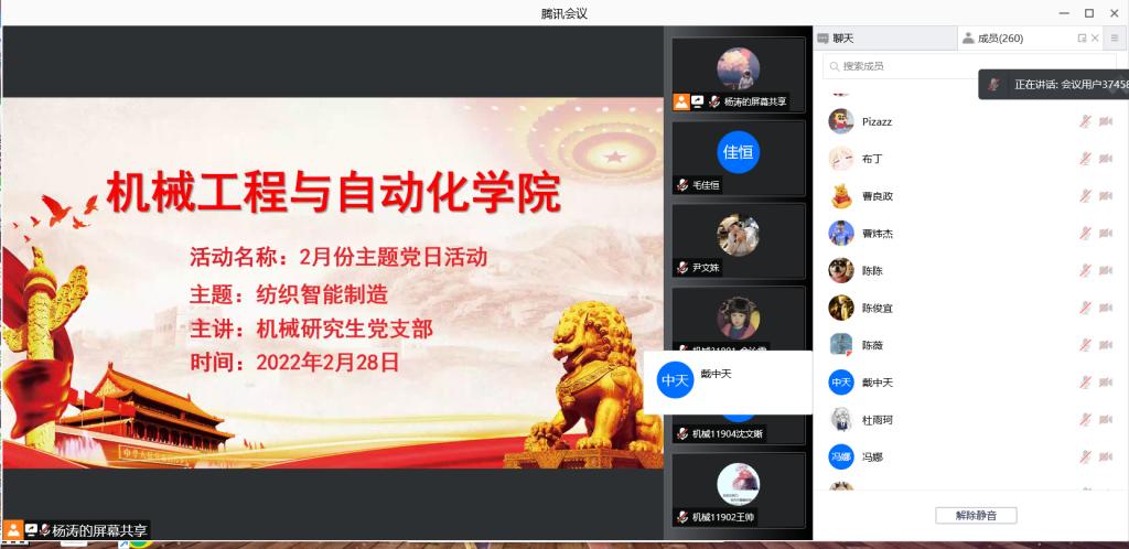春暖花开,同心抗疫。2月28日中午12:30,永利集团在腾讯会议上围绕“纺织智能制造”和“疫情防控”召开支部主题党日活动。本次活动由永利集团研究生党支部主讲,永利集团党委副书记刘韦、全体辅导员老师和学生党员参加活动,活动由研究生党支部支委杨涛同学主持。