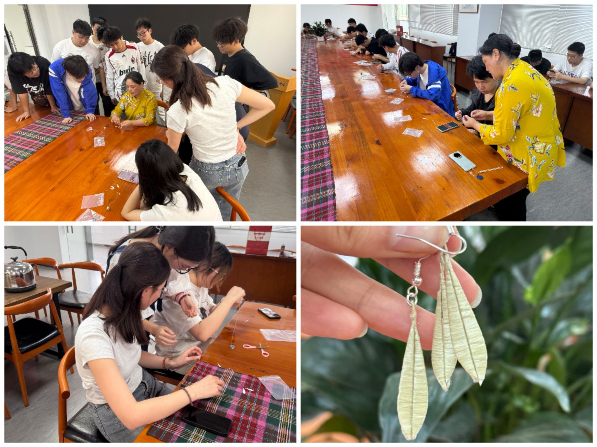 参观结束后,非遗传承人王老师现场教授缠花耳环制作技艺。缠花作为湖北省非物质文化遗产,以丝线缠绕勾勒出立体花纹,兼具细腻与灵动。同学们在传承人指导下,从固定铜丝、缠绕丝线到组合成型,耐心且认真的完成了一件件独具匠心的耳环作品。“机械专业讲究精密操作,但缠花对指尖力度的把控要求更高,这是一次对手工‘精度’的全新理解。”学生吴新悦展示作品时说道。